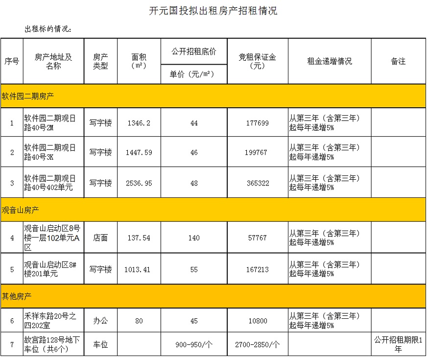 開元國投2019年7-9月到期、空置房產(chǎn)公開招租公告