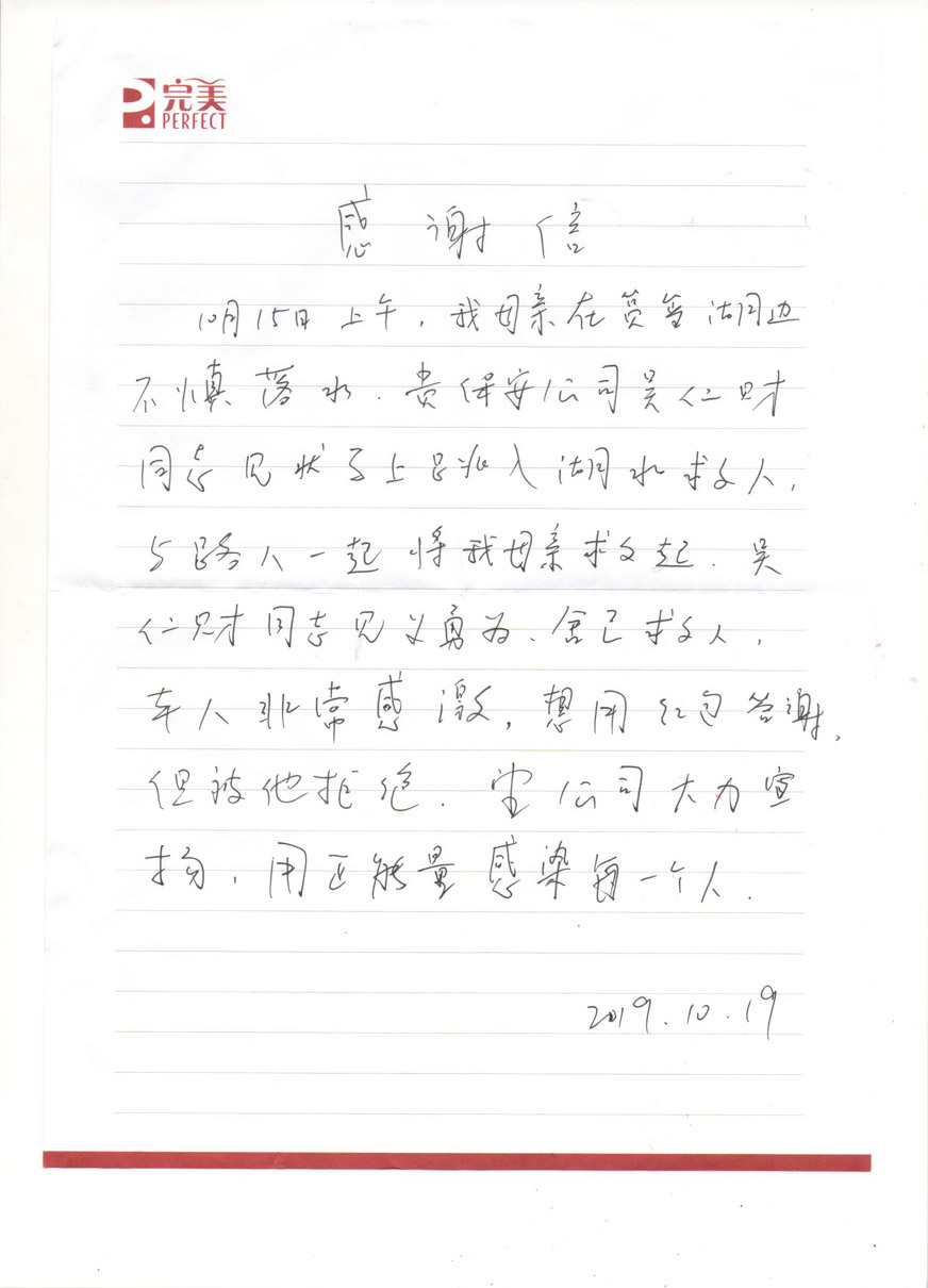 “關(guān)于老人摔倒扶不扶的問題,很多人談之色變,面對群眾危難,不會游泳的吳仁財(cái)沒有選擇冷漠和逃避,而是不懼危險(xiǎn),挺身而出、沉著冷靜、奮勇救人,真是驚心動魄,當(dāng)時(shí)水已經(jīng)淹到我母親胸口位置,情況萬分危急,若是再晚一分鐘施救就陰陽相隔了……吳仁財(cái)同志也是挽救了我們整個(gè)家庭!”被救的老婦人兒子章先生情緒十分激動,噙著淚花如是說,一再感謝善良保安員吳仁財(cái)同志的救命之恩并準(zhǔn)備了紅包答謝,被吳仁財(cái)同志婉言謝絕了。
