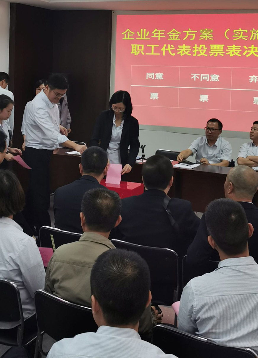 行政部負(fù)責(zé)人向大會(huì)作了《企業(yè)年金方案》的講解和說明,職工代表分組就《企業(yè)年金方案(實(shí)施細(xì)則)》進(jìn)行討論,最后與會(huì)職工代表以無記名投票方式表決通過了《企業(yè)年金方案(實(shí)施細(xì)則)》。