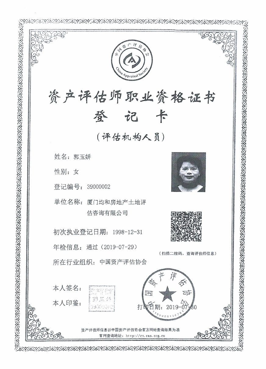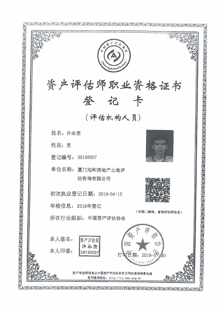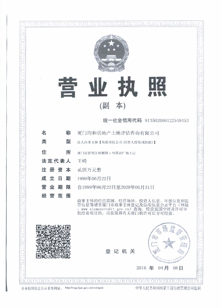 2.廈門均和房地產(chǎn)土地評估咨詢有限公司相關(guān)資質(zhì)證書