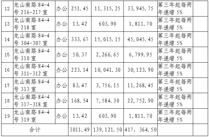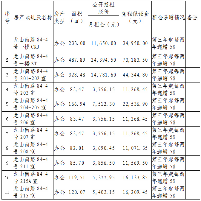 根據(jù)國有企業(yè)資產(chǎn)出租管理相關(guān)制度,我司決定對位于思明區(qū)龍山南路84-4號樓部分面積房產(chǎn)對符合入駐條件的意向承租人進行公開競價招租,具體信息如下: