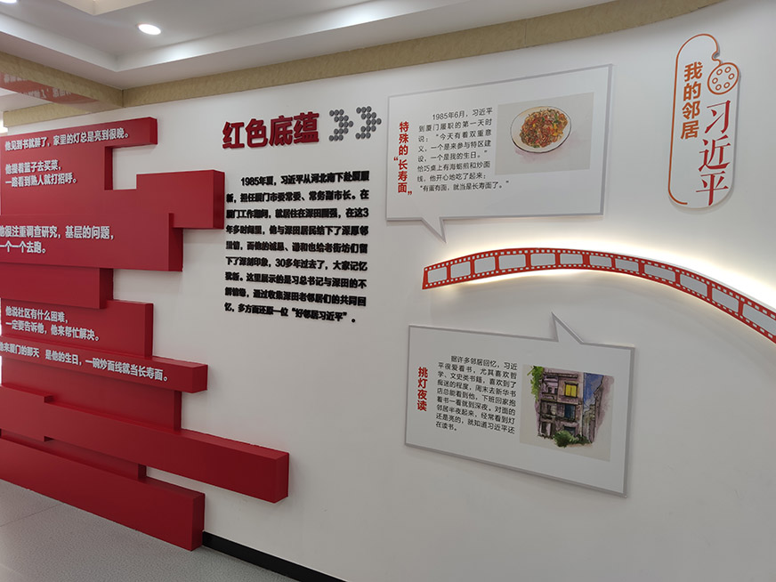 在政治生活館內(nèi),從特別的“長(zhǎng)壽面”、簡(jiǎn)樸的婚禮、一張手寫明信片等一件件溫馨事跡,從觀看《我的鄰居習(xí)近平》錄像片到聽小朋友生動(dòng)講述習(xí)爺爺?shù)墓适?,?ldquo;我可以叫你小習(xí)嗎”“伊是阮的好厝邊”及“深田讀冊(cè)歌”等小片段中,讓我們仿佛看到了當(dāng)年習(xí)近平總書記入鄉(xiāng)隨俗、與深田居民一起嘮嘮嗑、拉家常的生活場(chǎng)景,直觀感受了習(xí)近平總書記平易近人、誠(chéng)懇謙和、勤奮好學(xué)的優(yōu)秀品格以及一心為民、清廉務(wù)實(shí)的工作作風(fēng)。