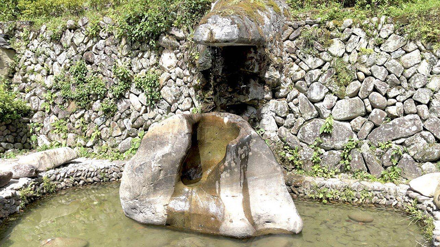 下黨鄉(xiāng)的滴水石穿主題園里,我們看到了小時(shí)候“滴水穿石”典故里的巨大石頭。烈日下,清水依舊流淌。