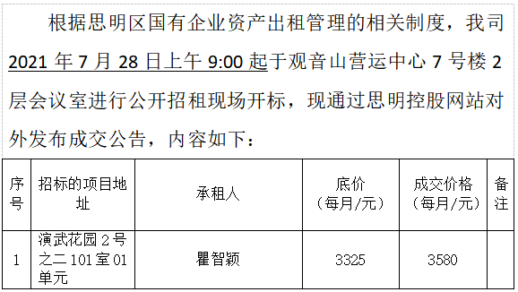 演武花園2號(hào)之二101室01單元房產(chǎn)招租成交公告