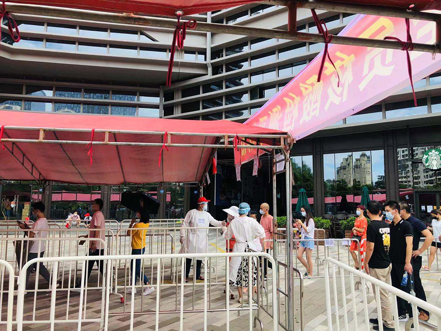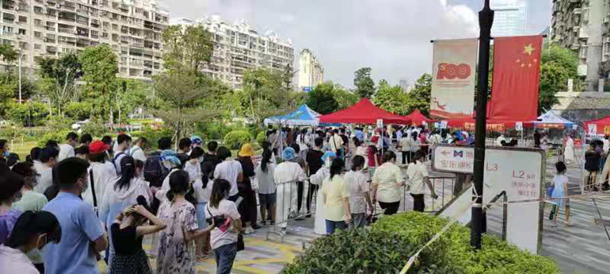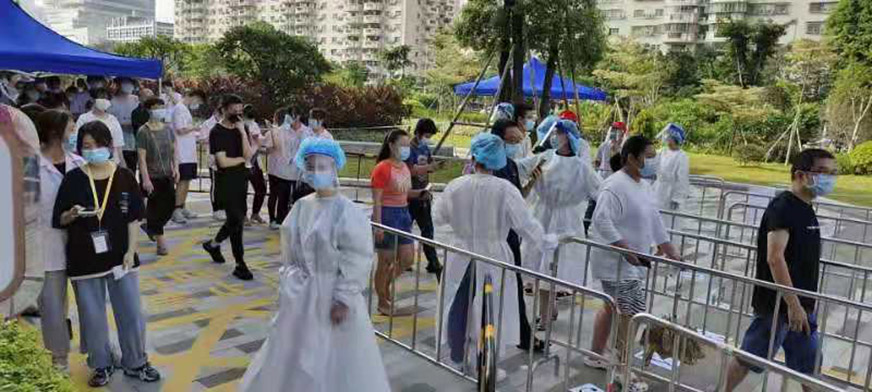 在支援的過程中,他們的額頭、臉部、手腕出現(xiàn)了深深的勒痕,甚至有志愿者出現(xiàn)了中暑虛脫的癥狀,卻仍然頑強(qiáng)地堅守著。直到第二輪、第三輪核酸檢測,他們依舊聞令而動,主動請纓,沖鋒在前。