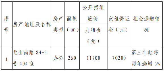 根據(jù)國有企業(yè)資產(chǎn)出租管理相關(guān)制度,我司決定對位于龍山南路84-5號404室房產(chǎn)對符合入駐條件的意向承租人進(jìn)行公開競價招租,具體信息如下: