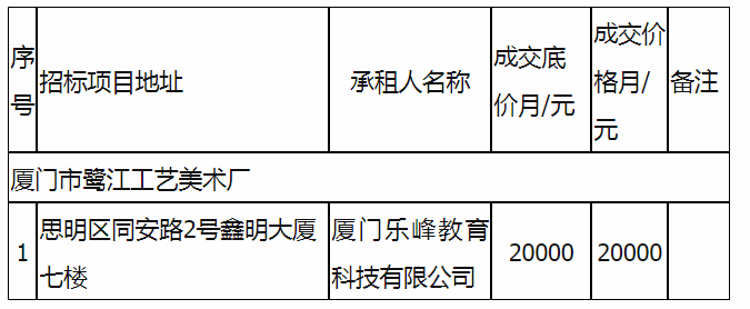 根據思明區(qū)國有企業(yè)資產出租管理的相關制度,我司2021年10日上午9:00起于廈門市思明區(qū)觀音山國際商務營運中心2樓2層2會議室進行公開招標現(xiàn)場開標,現(xiàn)通過思明控股網站對外發(fā)布成交公告,內容如下: