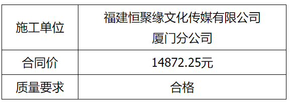 根據(jù)招投標(biāo)管理辦法、思明控股辦[2021]14號文《采購招標(biāo)管理辦法》的相關(guān)規(guī)定,我司負(fù)責(zé)龍山文創(chuàng)園標(biāo)識牌制作及工業(yè)設(shè)計中心大門左側(cè)空調(diào)外機圍擋工程直接發(fā)包福建恒聚緣文化傳媒有限公司廈門分公司實施,現(xiàn)通過思明控股網(wǎng)站于2021年12月27日至2021年12月30日進行成交結(jié)果公示,內(nèi)容如下: