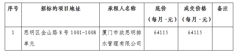 根據(jù)思明區(qū)國有企業(yè)資產(chǎn)出租管理的相關(guān)制度,我司2021年12月17日上午10:00起于廈門市思明區(qū)嶺兜西路623號3樓商管公司會議室進行公開招標(biāo)現(xiàn)場開標(biāo),現(xiàn)通過思明控股網(wǎng)站對外發(fā)布成交公告,內(nèi)容如下: