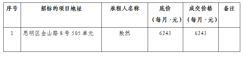 根據(jù)思明區(qū)國有企業(yè)資產(chǎn)出租管理的相關(guān)制度,我司2021年11月28日上午10:00起于廈門市思明區(qū)嶺兜西路623號(hào)3樓商管公司會(huì)議室進(jìn)行公開招標(biāo)現(xiàn)場(chǎng)開標(biāo),現(xiàn)通過思明控股網(wǎng)站對(duì)外發(fā)布成交公告,內(nèi)容如下: