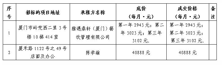 根據(jù)思明區(qū)國有企業(yè)資產(chǎn)出租管理的相關(guān)制度,我司2022年1月25日上午9:00起于廈門市前埔工業(yè)園1號全和公司七樓會議室進行公開招租現(xiàn)場開標,現(xiàn)通過思明控股網(wǎng)站對外發(fā)布成交公告,內(nèi)容如下: