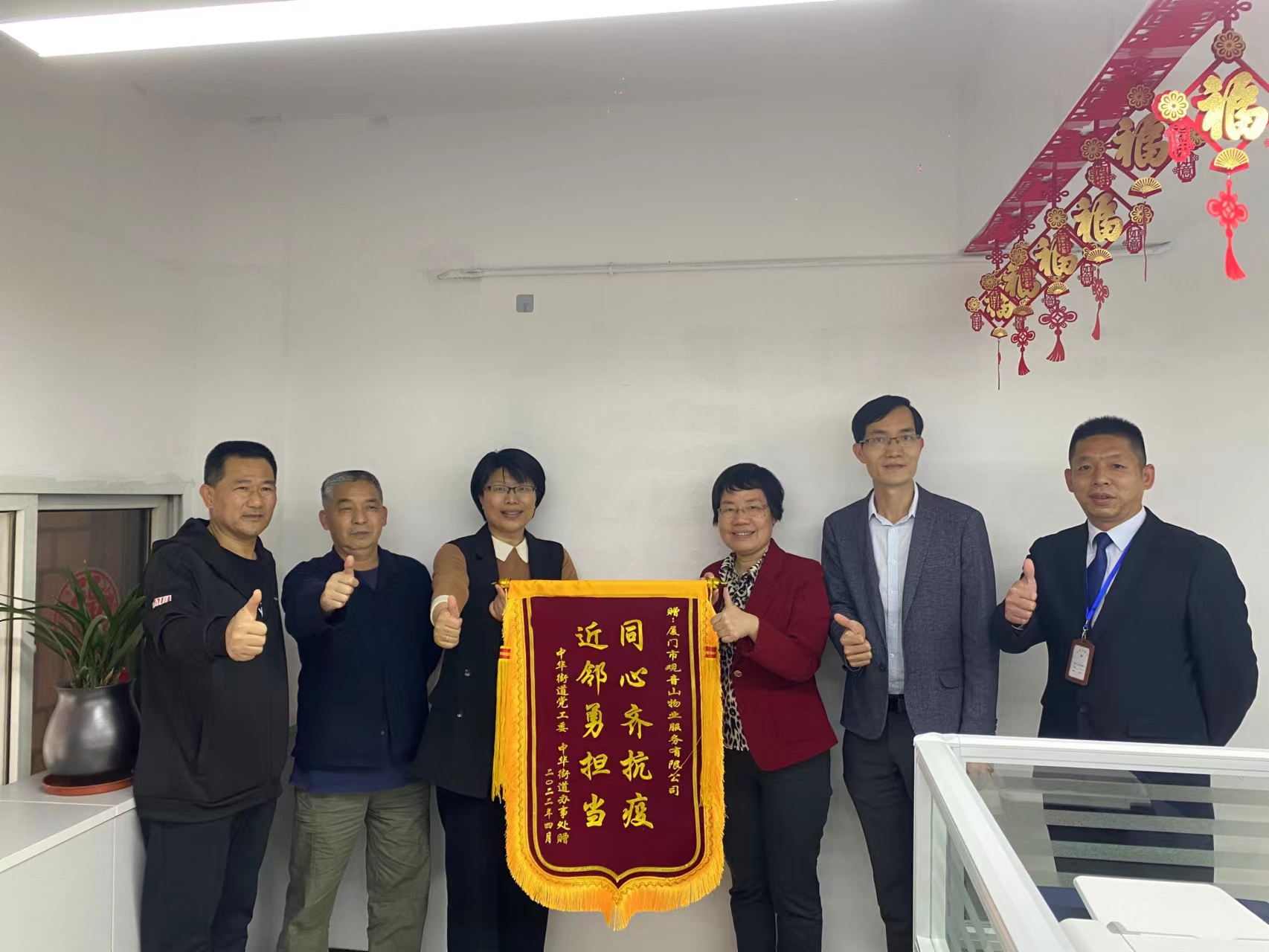 4月20日下午,中華街道黨工委副書記、街道辦主任王雪梅率街道四級調(diào)研員嚴開松、黨政辦負責人蘇江圳一行給思明控股觀音山物業(yè)所屬中山路服務中心送上錦旗和慰問信,感謝思明控股集團觀音山物業(yè)中山路服務中心團隊全力配合協(xié)助街道疫情防控工作,對團隊致以崇高的敬意和衷心的感謝。