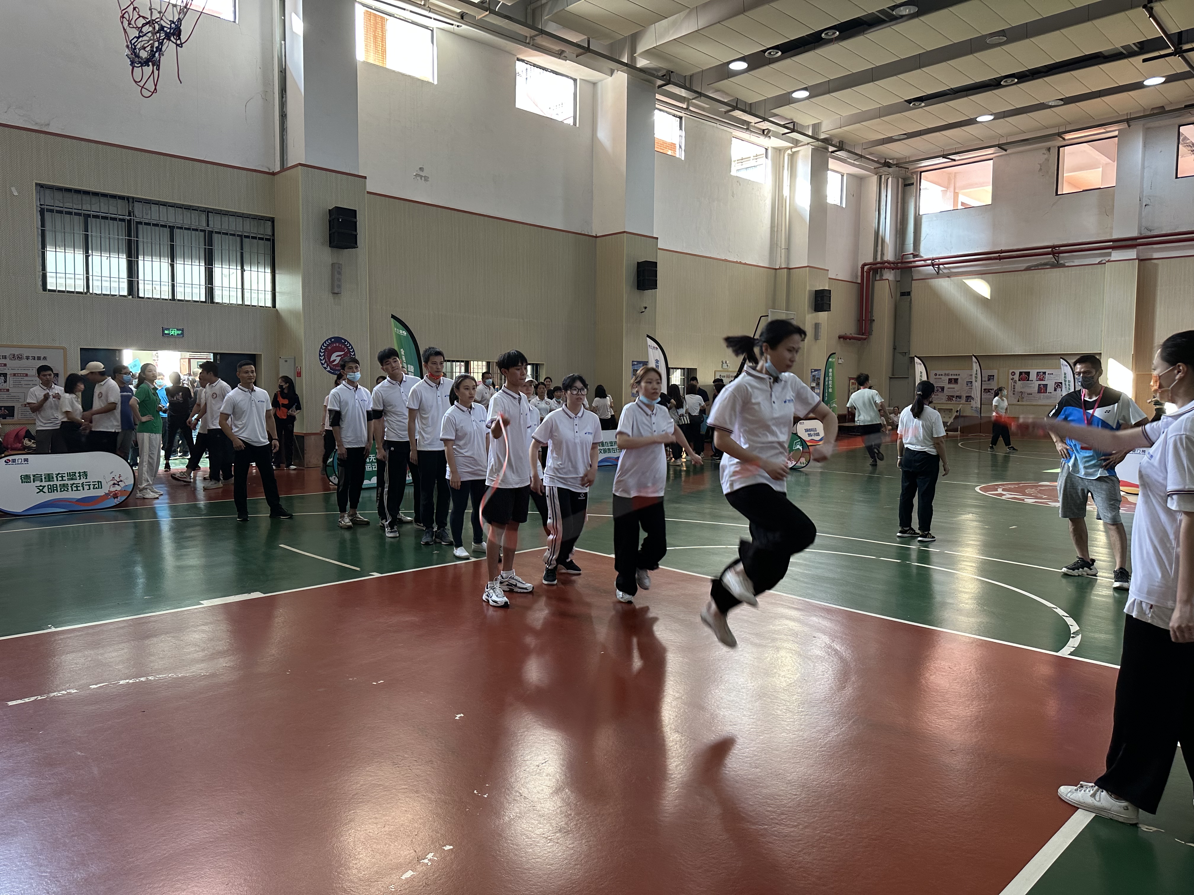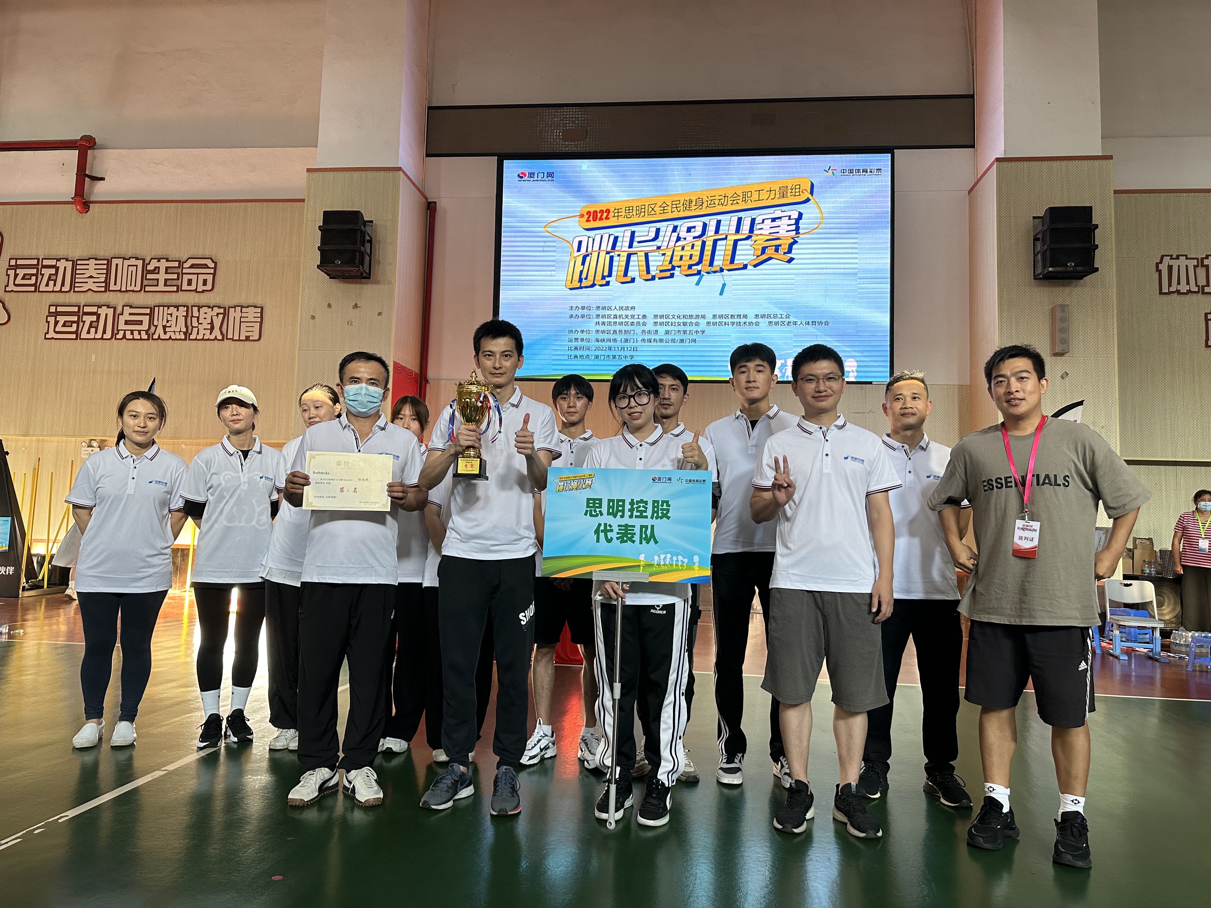 11月12日下午,2022年思明區(qū)全民健身運動會職工跳長繩競賽在廈門五中籃球場舉行,這是運動會職工力量組的第二項比賽。思明控股集團由15名運動員代表組成的參賽隊,齊心協(xié)力,越戰(zhàn)越勇,繼8月7日拔河比賽捧起冠軍獎杯后,又捧起了跳長繩競賽的季軍獎杯。