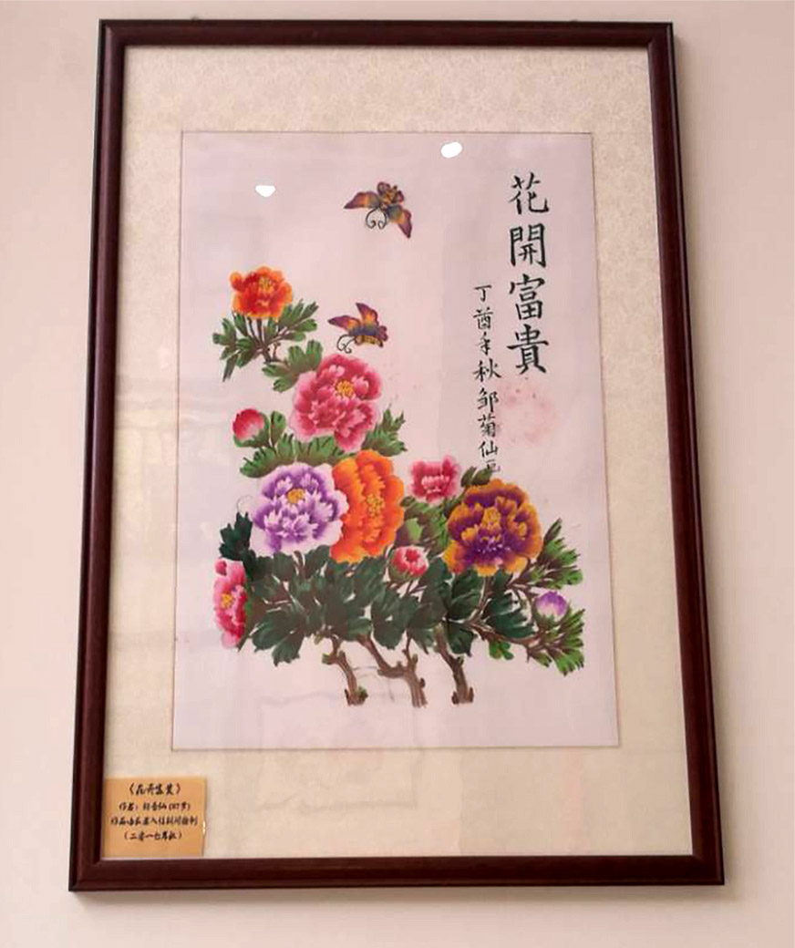 一幅幅栩栩如生的美麗書(shū)畫(huà)作品,展現(xiàn)在1樓大廳顯眼的位置,給整個(gè)公寓增添了幾分生氣。走進(jìn)一看,有鄒菊仙奶奶的芬芳引蝶花開(kāi)富貴牡丹,有98歲陳周光爺爺?shù)脑佀梢约懊坊ㄏ阕钥?/span>寒來(lái)作品,有80歲楊婉瑩奶奶的書(shū)法作品九成宮醴泉銘,還有汪建榮爺爺?shù)臅?shū)法社會(huì)主義價(jià)值觀.....這幾位爺爺奶奶看到自己的書(shū)畫(huà)作品展示在公寓展示欄里,甚是欣喜和滿足,他們也成為了我們?cè)慈角f老年公寓的小有名氣的書(shū)畫(huà)家。