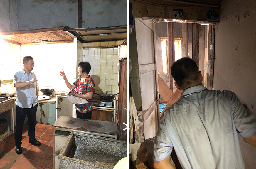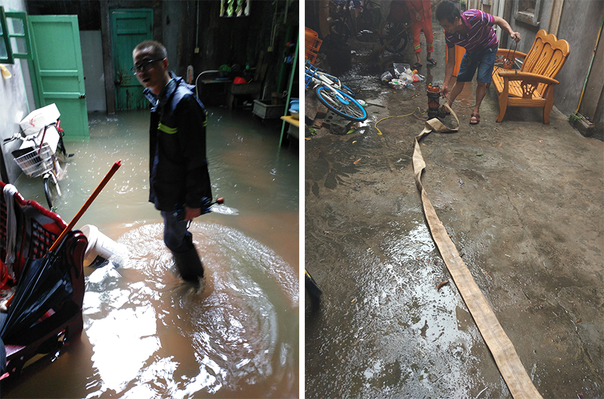 當(dāng)工作人員巡查至雙蓮池時,雙蓮池已成一片澤國,而雙蓮池52號更是猶如海中孤島一樣積水極深,工作人員不顧積水之深,穿過過膝的積水來到住戶家中,拿起掃把、拖把幫忙掃除房屋內(nèi)的積水,并向上級申請抽水泵排水已解燃眉之急。經(jīng)過工作人員與住戶的不懈努力,積水終于被清理干凈,也還住戶一個安心的家。