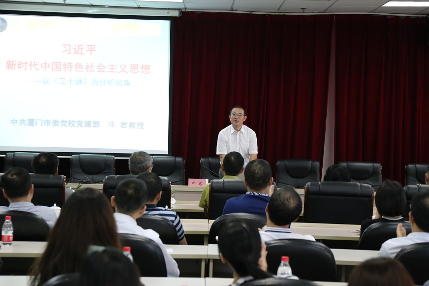 為進(jìn)一步把學(xué)習(xí)宣傳貫徹習(xí)近平新時(shí)代中國(guó)特色社會(huì)主義思想引向深入,在思明控股集團(tuán)持續(xù)興起“大學(xué)習(xí)”“大宣講”熱潮,11月9日下午,思明控股集團(tuán)黨委邀請(qǐng)廈門市委黨校黨建教研部副主任、教授牛君作“習(xí)近平新時(shí)代中國(guó)特色社會(huì)主義思想——以《三十講》為分析視角”專題黨課。思明控股集團(tuán)領(lǐng)導(dǎo)班子、所屬一級(jí)子公司中層副職(含所屬二級(jí)子公司副職)以上人員及全體在廈黨員共170余人參加了學(xué)習(xí)。
